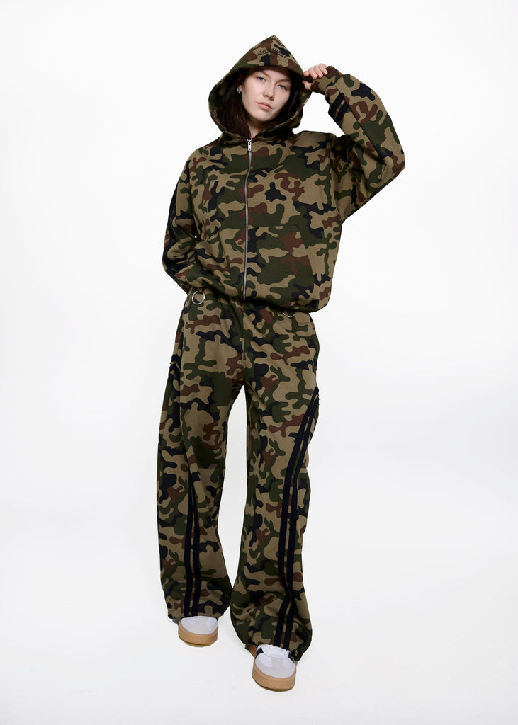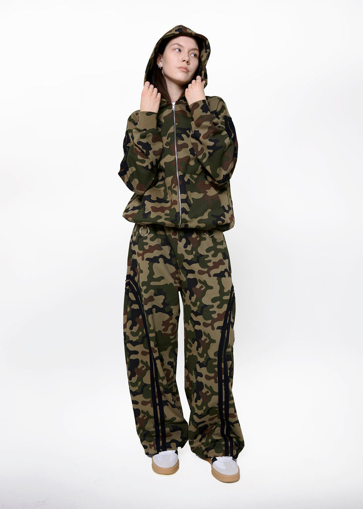 + Moro extra oversized sweatpants. Two side pockets. Elastic waistband with drawstring. Elastic leg width adjustment. Decorative ring on the belt loop.
