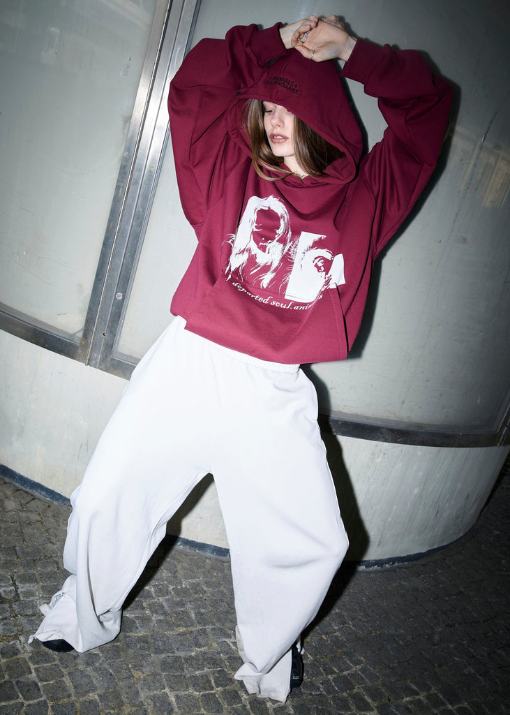 Bordowa bluza z kapturem. Na przodzie bluzy duży nadruk wykonany sitodrukiem. Na przodzie kieszeń typu kangurek. Na rękawach i na dole ściągacz. Na kapturze haft z logo. Regulowany ściągacz na dole bluzy z metalowym stoperem.